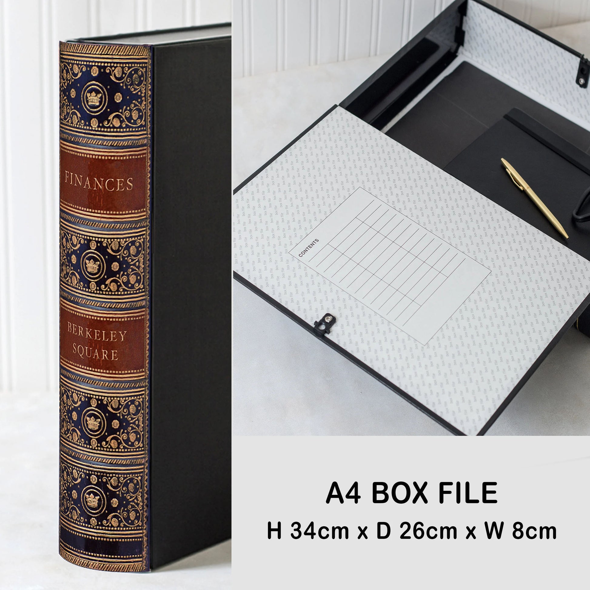 - A4 BOX FILE: H 34cm x D 26cm (28cm inc spine) x W 8cm