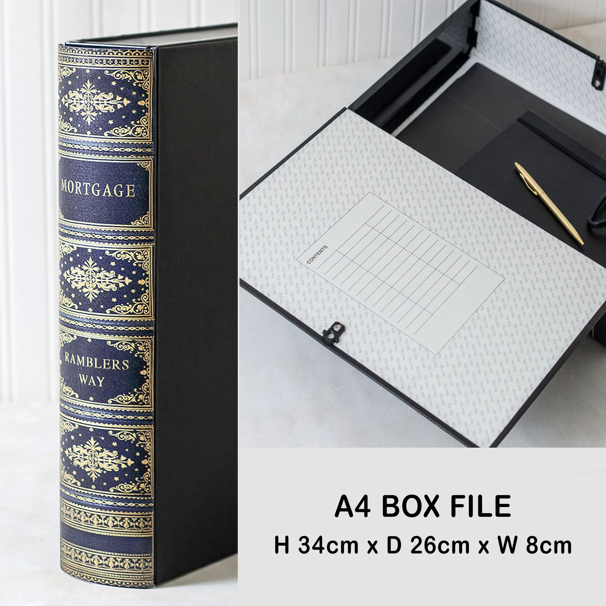 - A4 BOX FILE: H 34cm x D 26cm (28cm inc spine) x W 8cm
